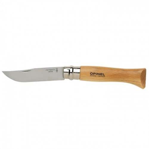 Cutit pliabil Opinel cu lama din otel inoxidabil. Lama are lungimea de de 9 cm iar manerul este din lemn de fag lacuit incolor. Sistemul Virobloc ajuta prin rasucire la blocarea lamei in pozitia deschis / inchis.
